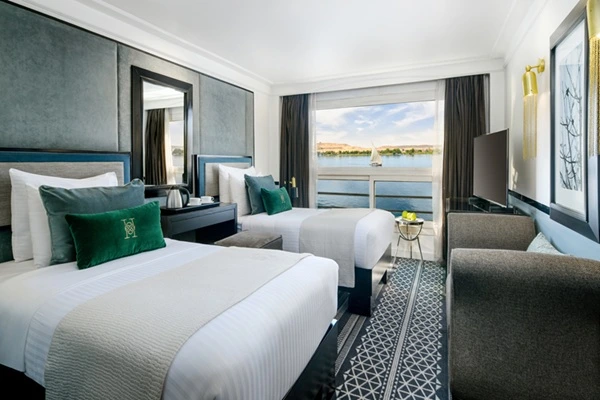🏨 Elegant check-in to your Movenpick Hamees Nile Cruise cabin with sweeping Nile views.
