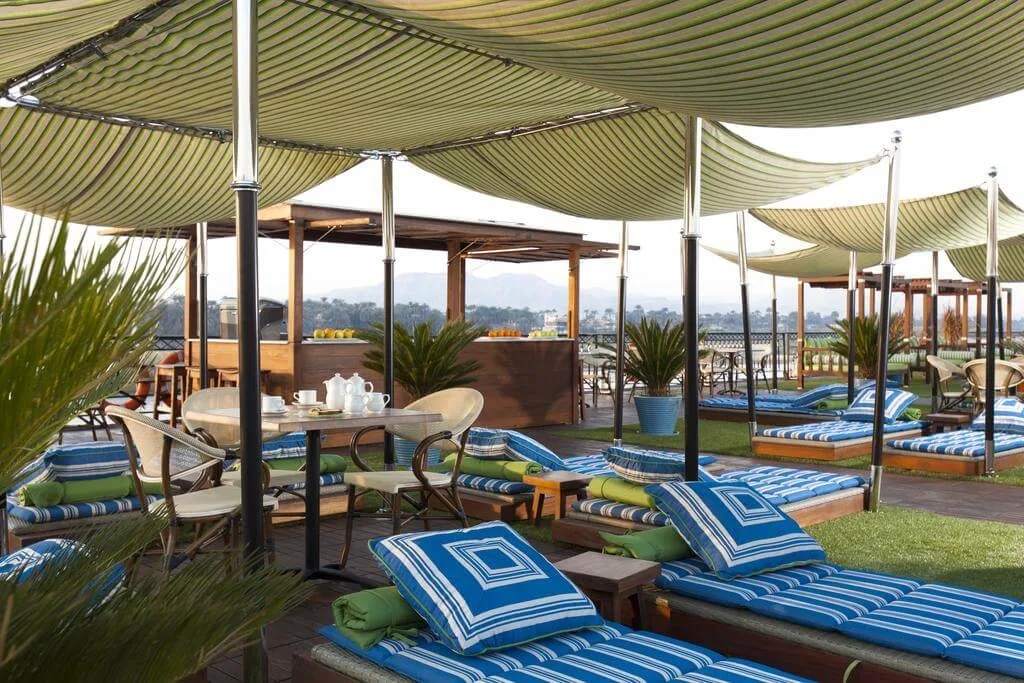 Unwind on the spacious sun deck with a swimming pool and lounge chairs, offering incredible Nile River views at every turn.